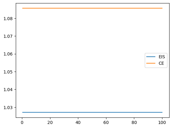 [ce_mu(samples, weights), eis_mu(samples, weights, P.log_prob(samples), s2)]