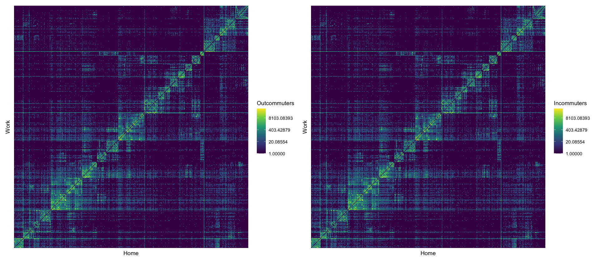 labs(x = "Home", y = "Work", fill = "Outcommuters")