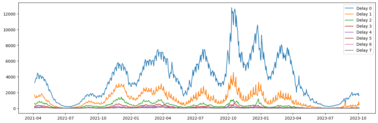 plt.legend([f"Delay {i}" for i in range(h.shape[1])])