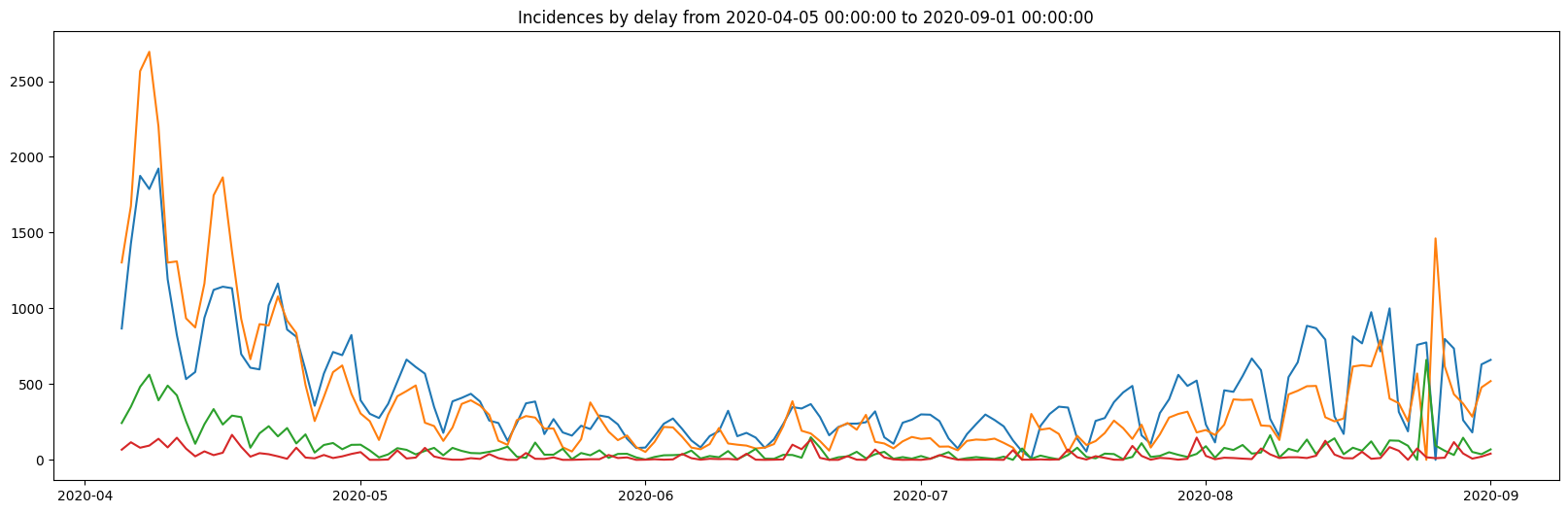 plt.title(f"Incidences by delay from {dates[0]} to {dates[np1-1]}")