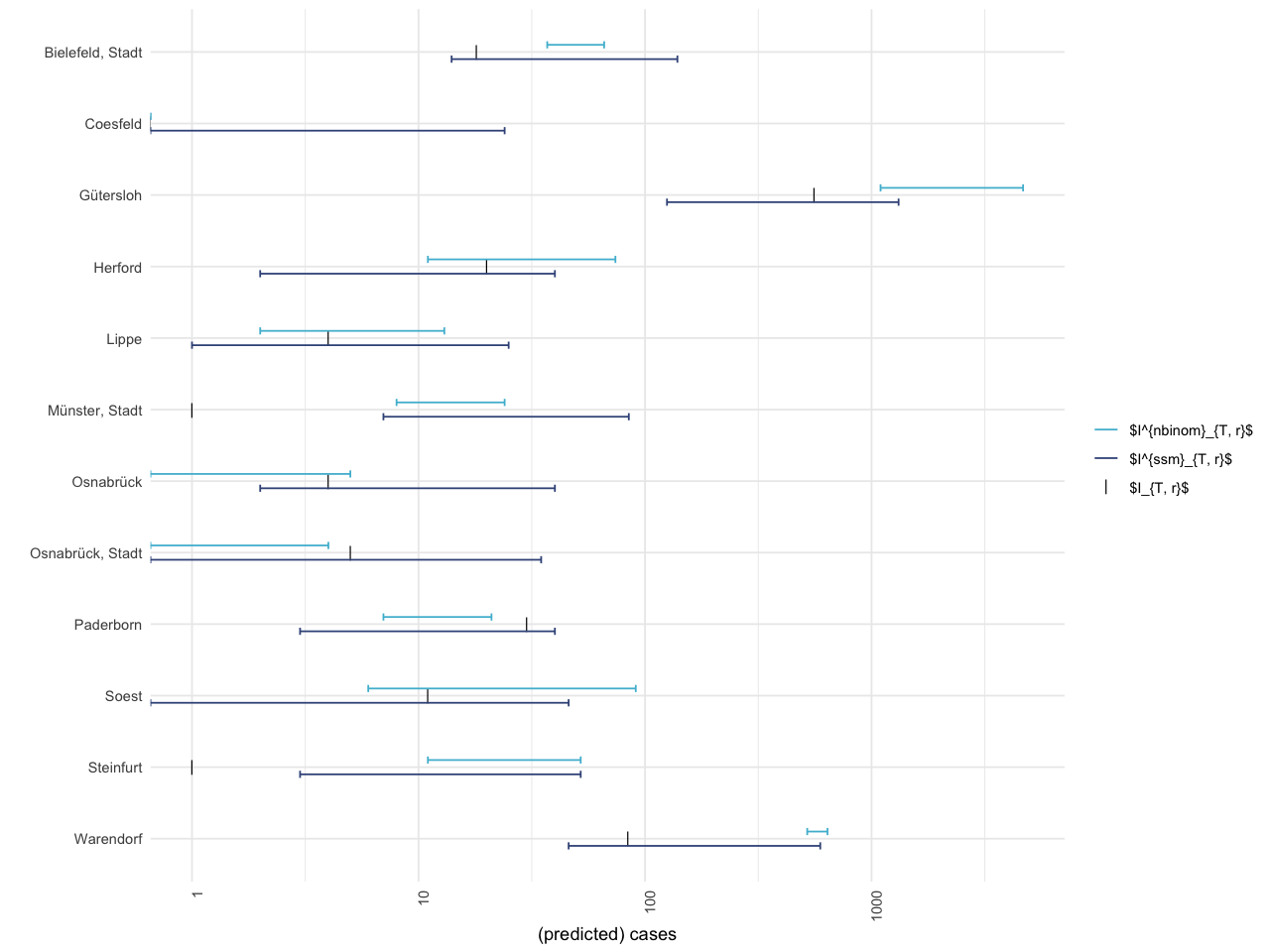 geom_errorbar(aes(ymin = `2.5 %`, ymax = `97.5 %`, color="$I^{nbinom}_{T, r}$"), data=nbinom_intervals, width=.1, position=position_nudge(x=nudge_x)) +